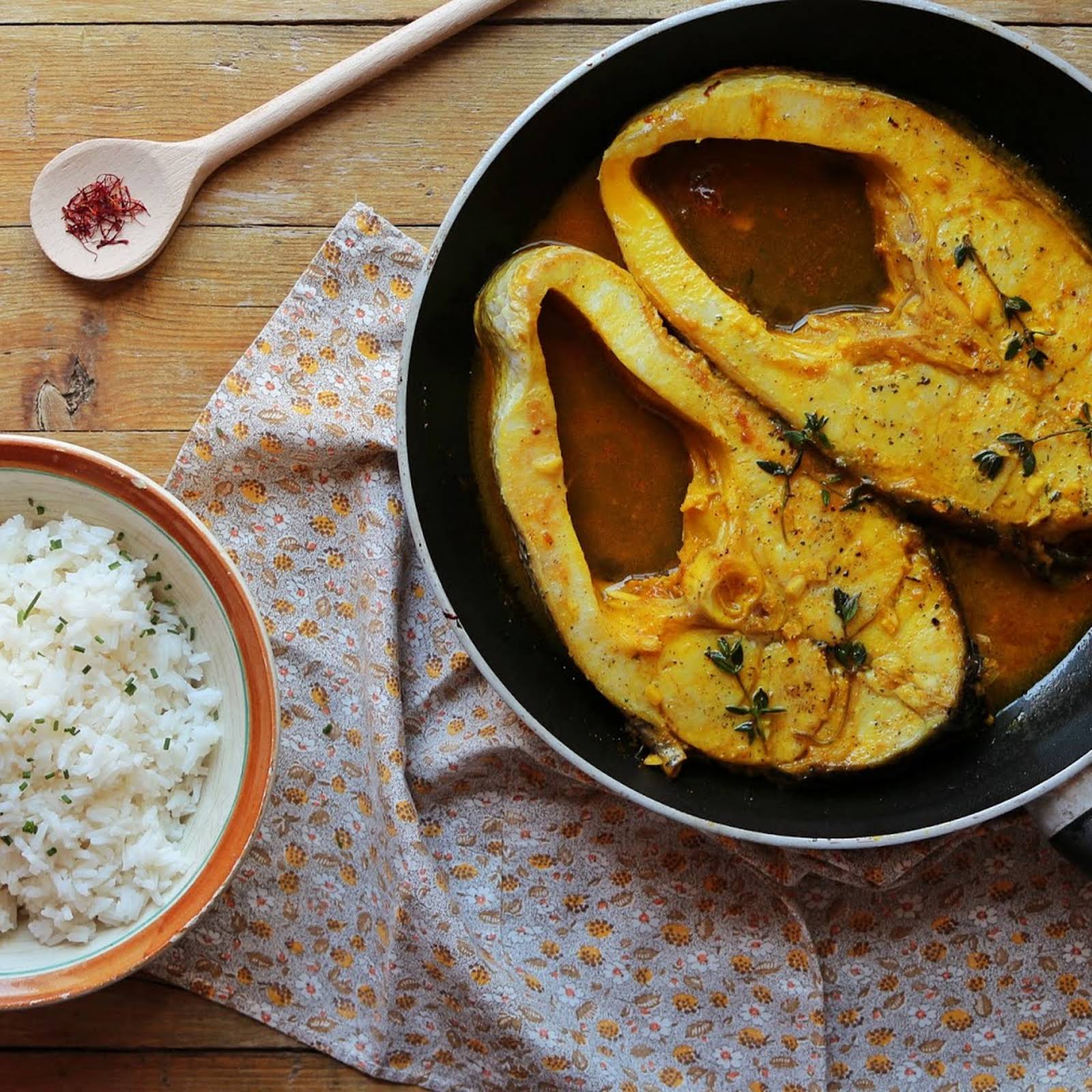 In a shallow bowl, mix together flour, cornmeal, salt and pepper. Prepare your fish sauce, in a separate large pan, fry some onions, tomatoes, add bell pepper, add cardamom spice, cook until mushy,. Rinse and pat dry with paper towels.